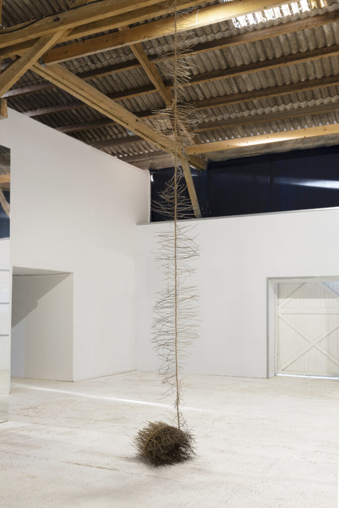 Une structure articulée de pointes, prend la forme d’un nid. Les épines de bois dur jouent leur rôle dissuasif et font tenir l’ensemble avec fragilité. Cette sculpture réinterprète le langage des haies et séparation paysagère auquel l’acacia fait couramment l’objet.