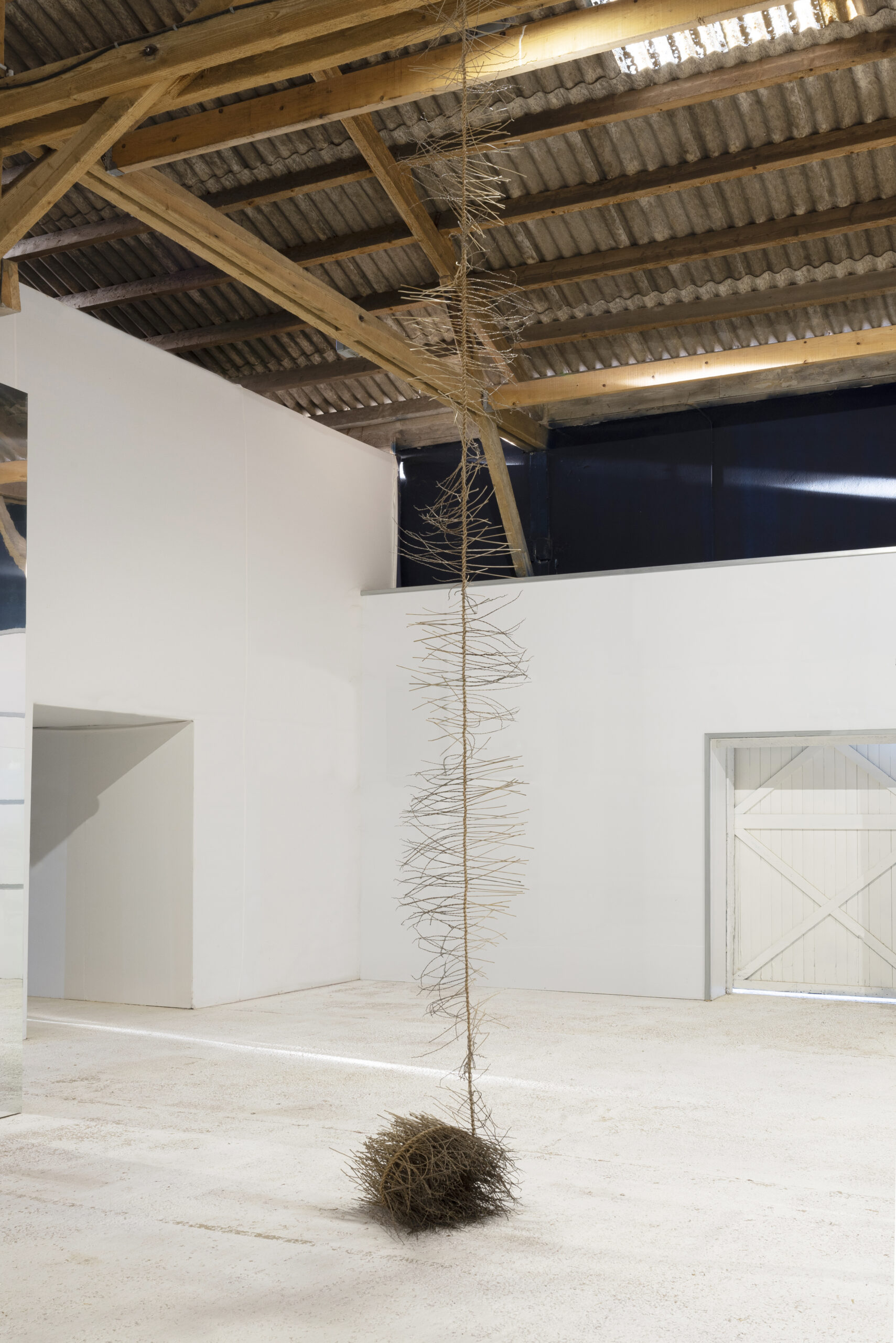 Bruissant à l’horizon (2023) sculpture, 18 mètres, olivier . Vue de l’exposition A wall of sugar, janvier 2023, Tour Orion, Montreuil, commissariat Collectif Nest.