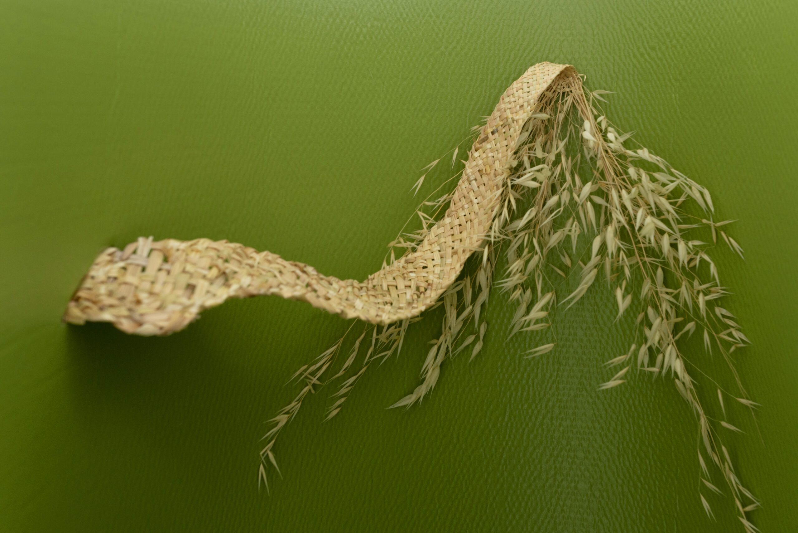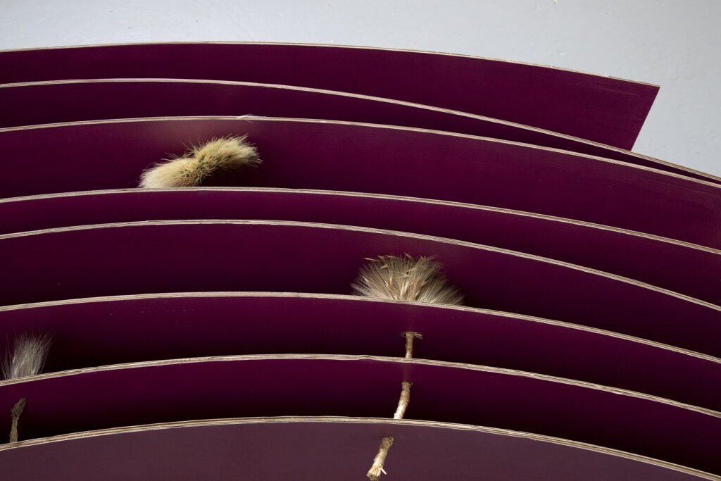 Champs, 2021, Sculpture, carton ondulé peint, orge des rats tressé, détail.