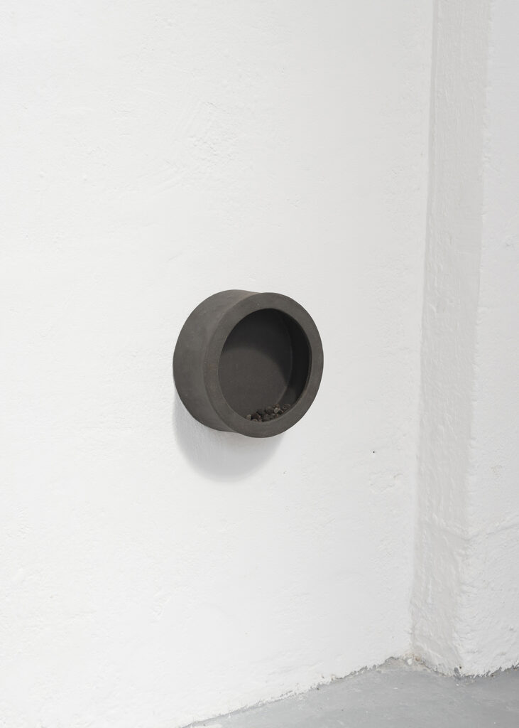 Pelotes, 2022, céramique, grès noir et blanc émaillés, élastiques, carton, bois 200×150 cm. Vue de l’exposition L’Appel, 2022, Palais des Beaux Arts de Paris, commissariat Eugénie Touzé.