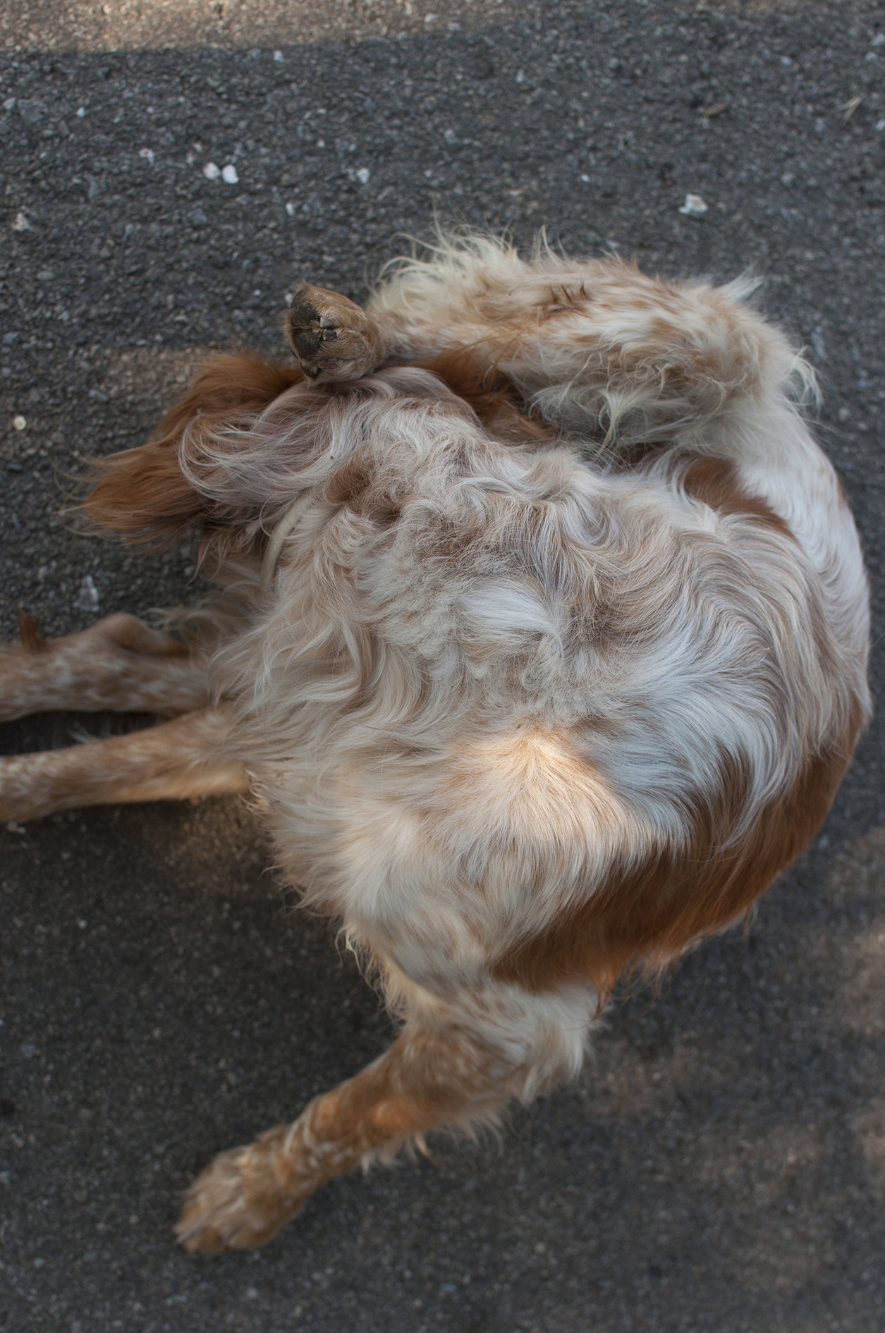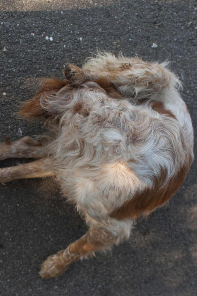 Deux enveloppes de corps vides se lézardent avant de réintégrer le sol ; l’occasion de songer à la fragilité de l’existence et du passage sur terre. Pour matérialiser la brûlure du soleil, certaines parties de l’image sont altérées par une disparition de la matière photographique. L’apparition progressive du blanc du papier résulte d’un mélange de procédés de tirages argentiques et numériques.